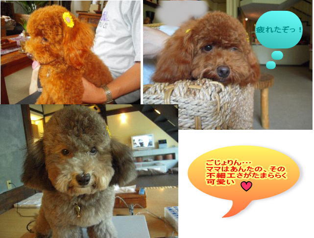 × [PR]上記の広告は3ヶ月以上新規記事投稿のないブログに表示されています。新しい記事を書く事で広告が消えます。 こんにちは。 PR 昨日は、夕立が降りそうだったので、早めにお散歩に出かけたんですが、すぐに振り出して早々に引き上げ。 一週間って早いですね。。。。。 最後に旅行中に動画がUPできなかったので、本日公開でぇ~す。 川津七滝近くの「肉月」でのランチの風景… ![]() ![]() さんちゃんと大根おろし こじょりんとさんちゃんの朝食はホテルラウンジの明るい陽射しの中で頂きます。 次は4日&5日目と立て続けに行った、ランチの御紹介 場所し下田の「スパイスドック」です。 雑誌にも掲載されていますが、ホテルでも紹介してくれました。 雰囲気も良いし、カレーがとっても美味しかった。 雑誌では、中型犬以上はテラスでって書いてありますが、大型犬も店内に入れてくれてました。 暑いからでしょうね。 犬にも人にも優しいお店です。 ランチから帰ると、ママはお風呂に入って、お昼ねタイム…(幸せ~ )と、すぐに、ちびっこギャングがお布団を占領します。 なので、ママは端っこでZZZZZ 本来はお布団にワンコはダメですよ。(笑) 粗相をしたら、クリーニング代を払いましょう! 14日はホテルでプロカメラマンの撮影会でした。 偶然にもそのカメラマンさんは5月に館山のしぶごえで撮ってもらった方でした。 わんこを撮らせたら日本一のカメラマンさんだそうです。 当然、5月同様お願いしました。 20分~30分、撮りまくりです。 上手いですよ、ホント… さんちゃん&ごじょりんは私がカメラを構えるとまずじっとしてないし、カメラ目線どころか、そっぽを向くんですから… それが、このカメラマンさんにかかると、あらら…(笑) 我が家はCDまるごとセット(10000円)を購入。 その中の一部を御紹介しま~す。 しっかり、デルモしてる2匹を見てやって下さい。 プロカメラマンに盛大なる拍手を ![]() 暑いですねぇ~ さんちゃんのドレス姿は可愛かったです ![]() わんこだけではなくて、人間用のドレスもたくさんあったので、是非記念にワンコと一緒に撮影してみて下さい。 12日は、さんちゃん&ごじょりんは、ホテルでシャプーのお手入れをしてもらいました。 普通は結婚式の前でしょ(爆) ママとパパが昼食に出かけて、ホテルに戻って来たのですが、2匹の仕上がりがまだだったので、 ホテルの看板犬2匹のうちの1匹、ヨークのくらのすけくんと一緒に待つ事になりました。 とてもハンサムボーイです。 待つ事、30分、さぁ、綺麗になったかな ![]() 今日は、なんと答えたらいいかわからないごじょりんに!