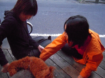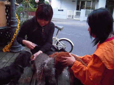 この女性達は通りすがりの人です。 さん&ごじょ&ラン兄貴に夢中です。 でも、黒い洋服の方は犬を触るのが初めてで、最初は中々触れませんでした。 まずは、おとなしめなごじょから挑戦です!!